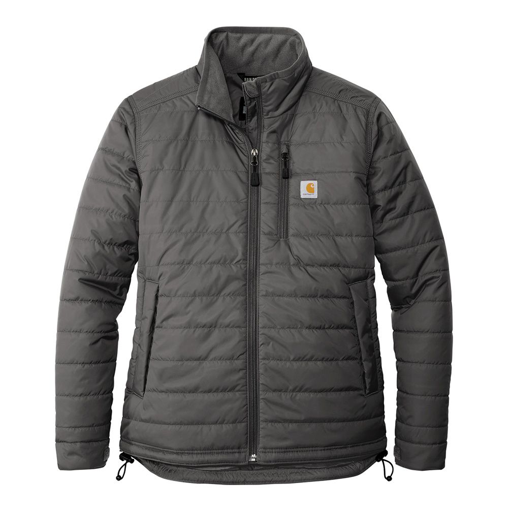 • Keep working through cold, wet weather in this women's version of our popular Gilliam Jacket. • 1.75-ounce, 100% nylon Cordura shell • Rain Defender durable water repellent • Wind Fighter technology tames wind • Nylon lining quilted to 100-gram polyester insulation • Reverse coil center front zipper • Zip-through collar • Left chest map pocket with reverse coil zipper • Two hand pockets with hidden snap closures • Two interior pockets: one zippered, one hook and loop closure • Hook and loop adjustable cuffs • Drawcord adjustable drop tail hem • Carhartt-strong, triple-stitched main seams • Carhartt label sewn on chest pocket • Relaxed fit