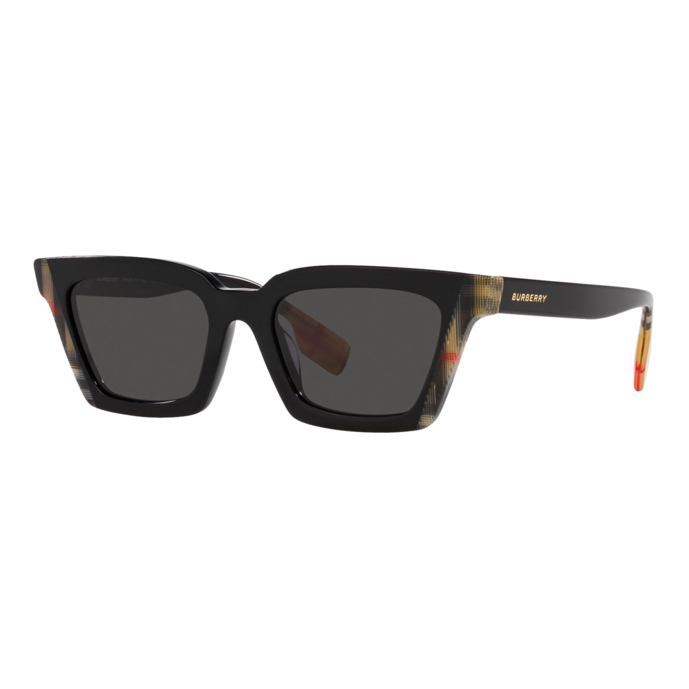 The Burberry Briar BE4392U sunglasses are an elegant, sharp silhouette that flaunts sweeping angles for a luxurious and flattering fit. This classic black acetate frame features splashes of Burberry check throughout for an iconic look that provides a vintage aesthetic. The fitted dark grey lenses offer category 3 protection from high UV rays, whilst finishing the look off in a sophisticated and elegant way. Eye size: 52; Frame: Black/Vintage Check; Lens: Dark Grey; Lens Material: Standard Plastic