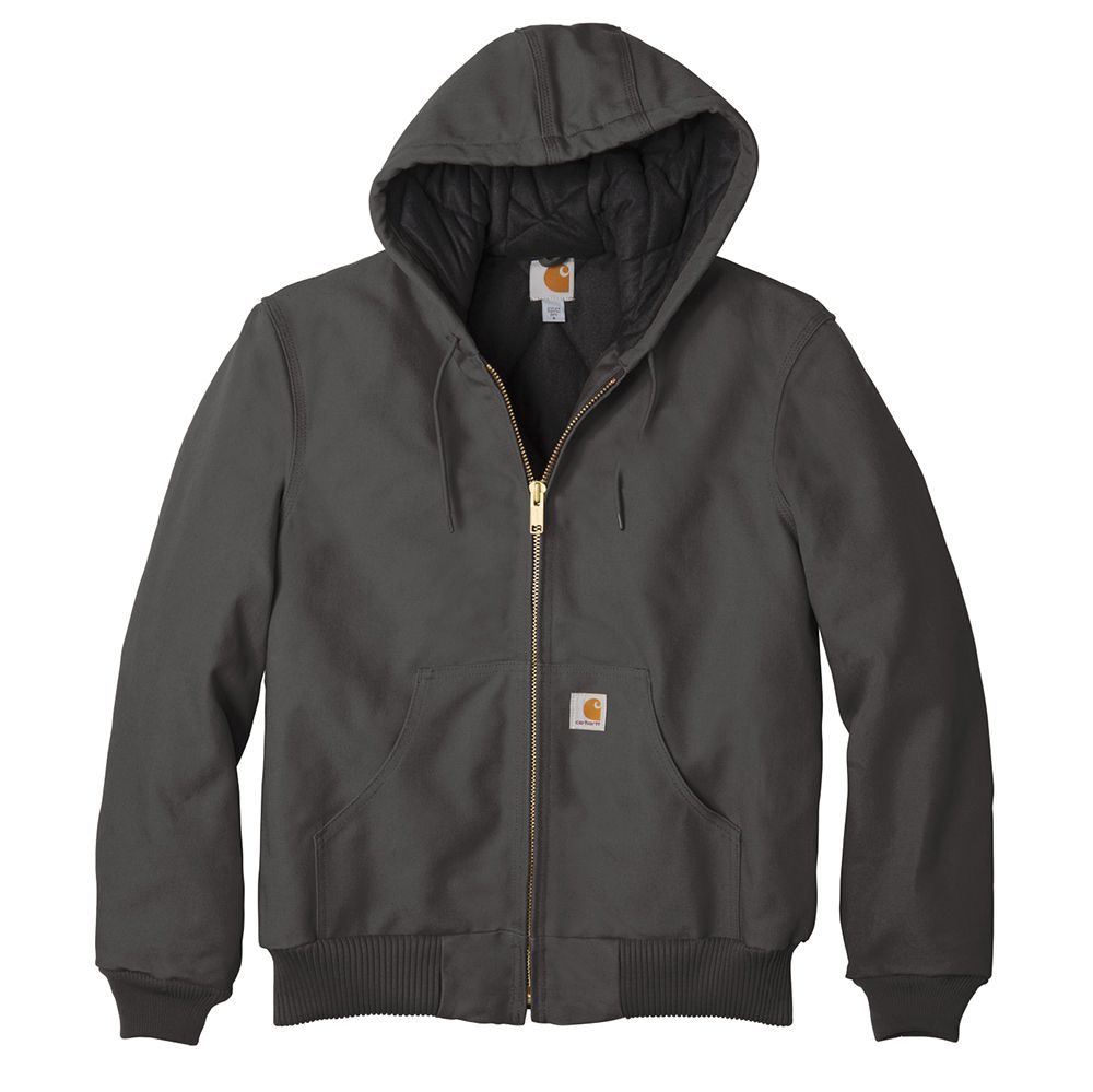• When Old Man Winter and Mother Nature get all riled up, reach for the Duck Active Jac. It can handle what this fearsome twosome dishes out. It's warm, versatile and rugged. • 12-ounce, firm hand, 100% ring spun cotton duck canvas • Water-repellent and wind-resistant • Quilted-flannel lining in body, quilted-nylon lining in sleeves • Attached quilted-flannel-lined three-piece hood with drawcord closure • Full-length brass front zipper • Two interior pockets: one zippered, one hook and loop • Two large hand pockets • Locker loop • Rib knit cuffs and waistband • Carhartt-strong, triple-stitched main seams • Carhartt label sewn on left pocket • Loose fit
