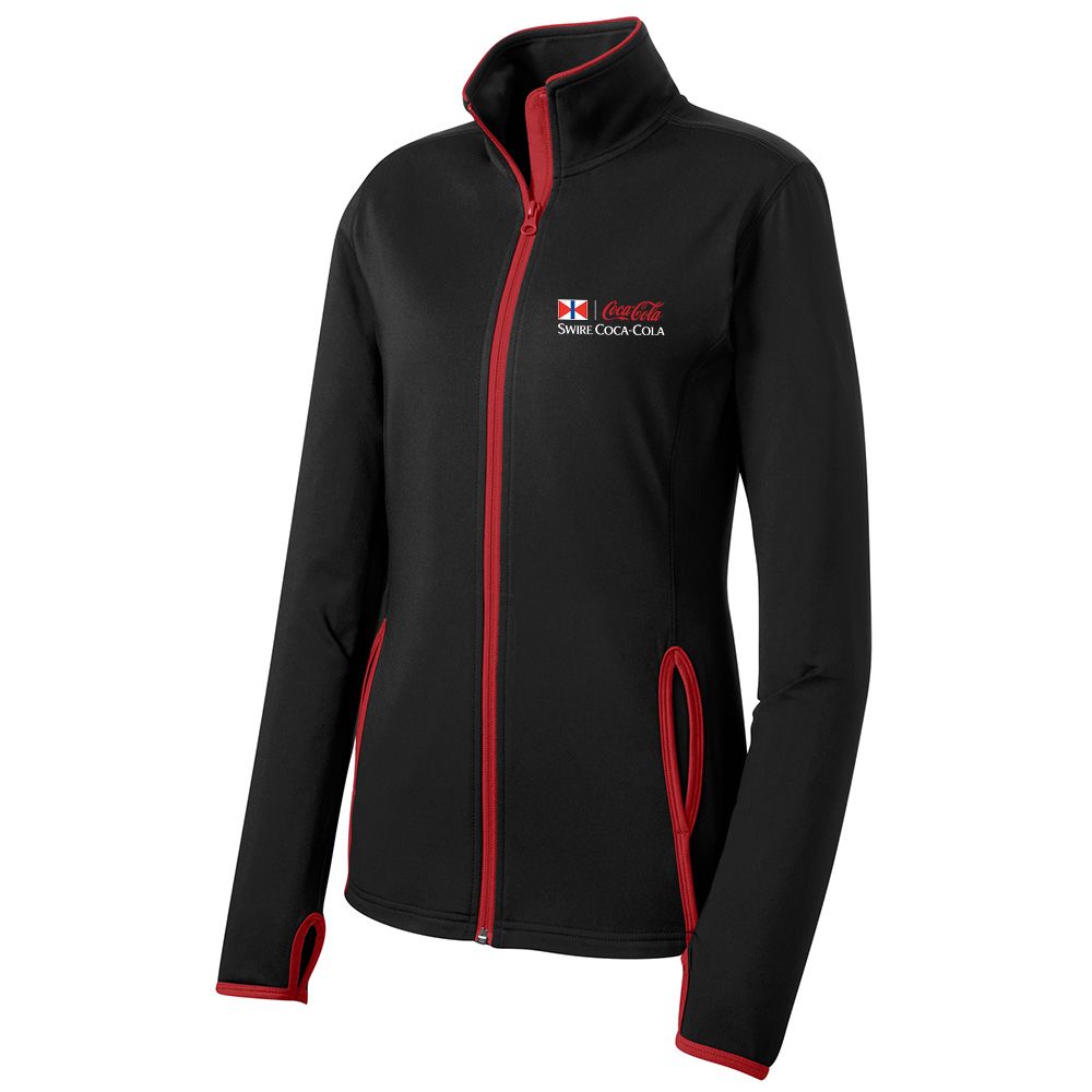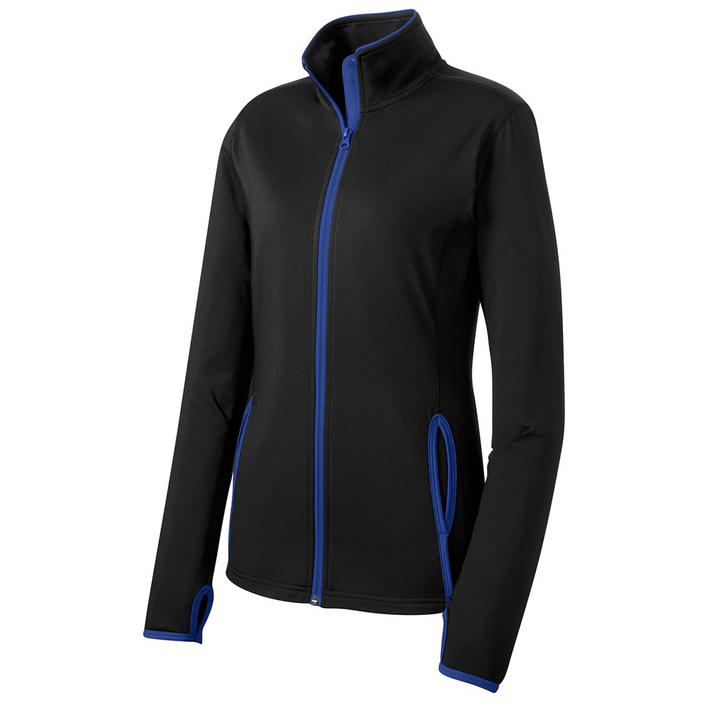 • Keep moving in this moisture-wicking, soft-brushed jacket that's flexible and features hits of contrast color throughout. • 6.8-ounce, 90/10 poly/spandex jersey • Cadet collar with contrast piping • Tag-free label • Taped neck • Contrast reverse coil zipper • Set-in sleeves • Contrast cuff binding • Thumbholes to keep hands warm • Contrast trim at front pockets and thumbholes