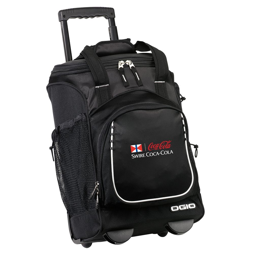 Party-sized cooler rolls with ease on sturdy wheels with an adjustable-height handle.