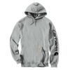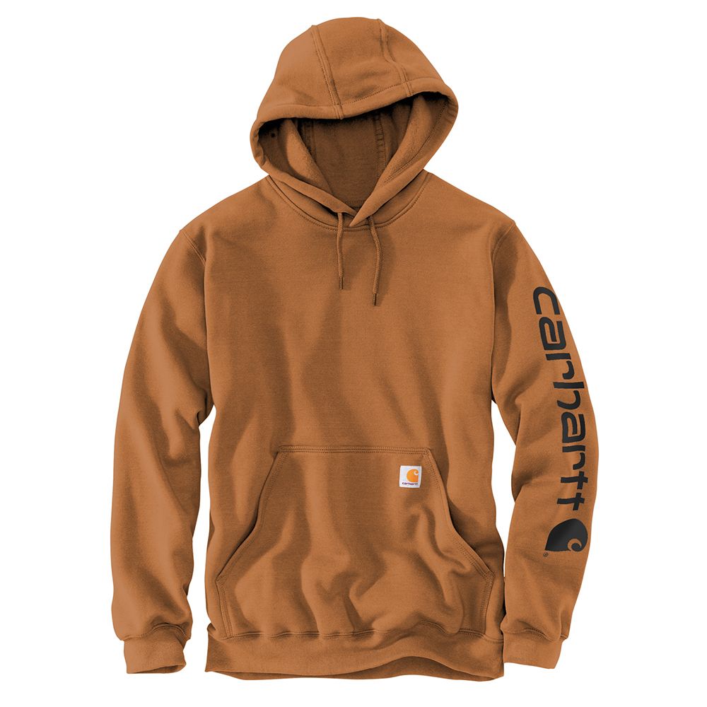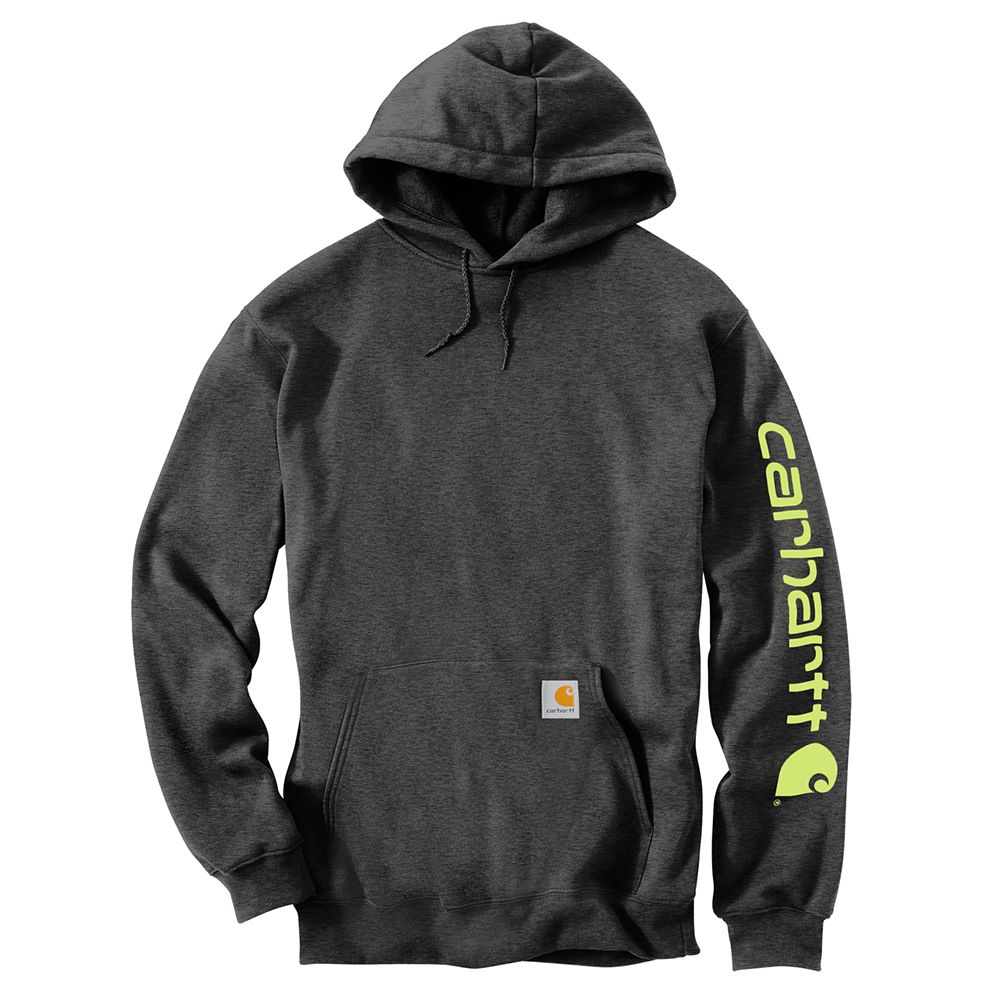 • Show your Carhartt pride in this versatile, layerable sweatshirt that features a bold Carhartt signature logo down the left sleeve. • 10.5-ounce, 50/50 cotton/poly blend or 59/41 cotton/poly blend (Black, Carbon Heather, Carhartt Brown, New Navy)* • 70/30 cotton/poly blend (Heather Grey) • Attached three-piece hood with drawcord closure • Carhartt signature logo down left sleeve • Front hand warmer pocket • Stretchable, spandex-reinforced, rib knit cuffs and waistband • Carhartt-strong, triple-stitched main seams for added durability • Carhartt patch sewn on handwarmer pocket • Loose fit • *Please note: Select colors in Carhartt fleece are currently transitioning from a 50/50 cotton/poly blend to a 59/41 cotton/poly blend. Weight and fabric properties remain the same. Your order may contain a combination of both fabrics.